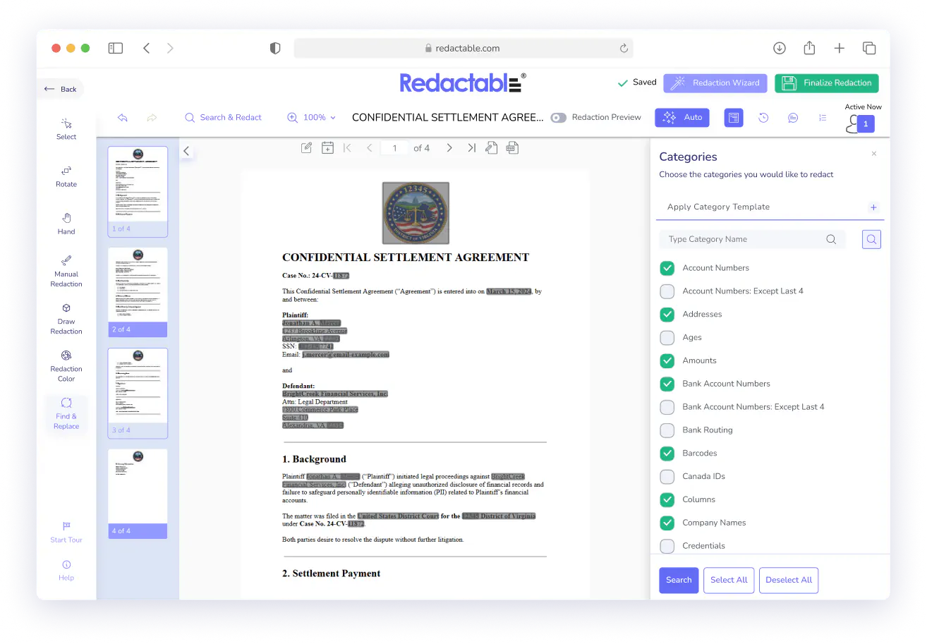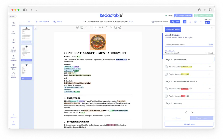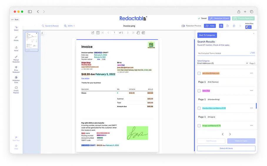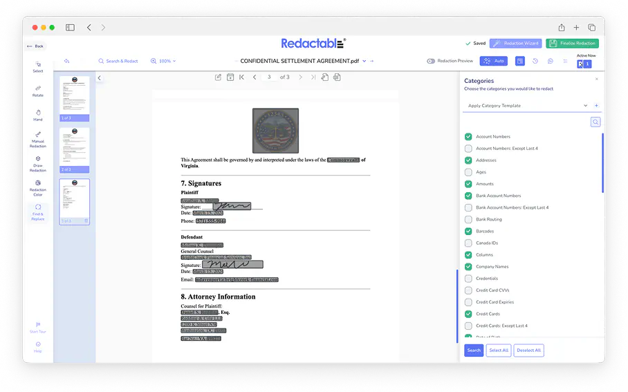 Our Redaction Wizard will find sensitive items for you to redact. Select the items you want to redact, then download the newly redacted document.