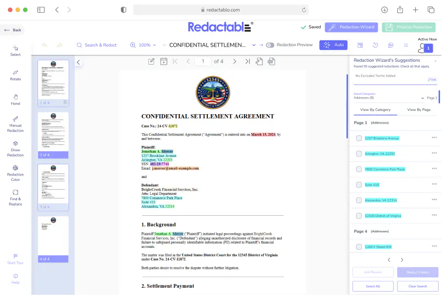 Redactable's automated redaction processes high-volume, multi-format documents in a fraction of the time manual review and legacy software requires, freeing your team to focus on higher-priority work instead of spending days redacting page by page.