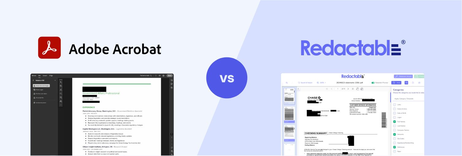 Having the right redaction software solution can help streamline the process of redaction while simultaneously enhancing accuracy and security. Here, we will share an in-depth comparison of Redactable vs. Redacting in Adobe to find the best PDF redaction software to fit your needs.