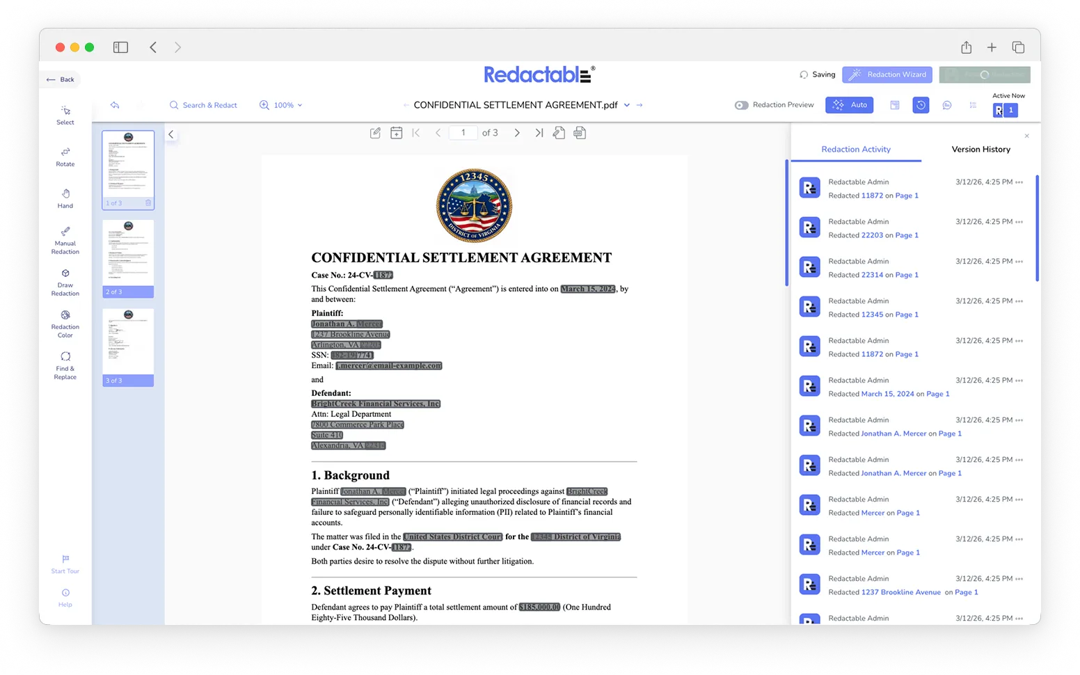 Redactable's automated redaction processes high-volume, multi-format documents in a fraction of the time manual review and legacy software requires, freeing your team to focus on higher-priority work instead of spending days redacting page by page